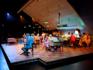 El estreno de una nueva producción de ABAO Bilbao Opera de Don Pasquale, inauguró la temporada 24-25 con una propuesta de Emiliano Suárez y escenografía de Alfons Flores que recreaba una típica pizzeria italiana donde a través de un girevole, cada movimiento descubría nuevos espacios: cocina, barra, restaurante, aparcamiento… en una profusión de escenarios llenos de detalles.